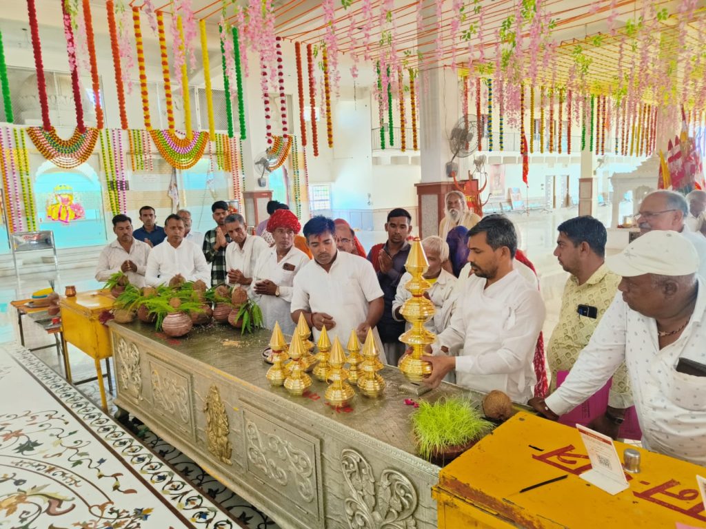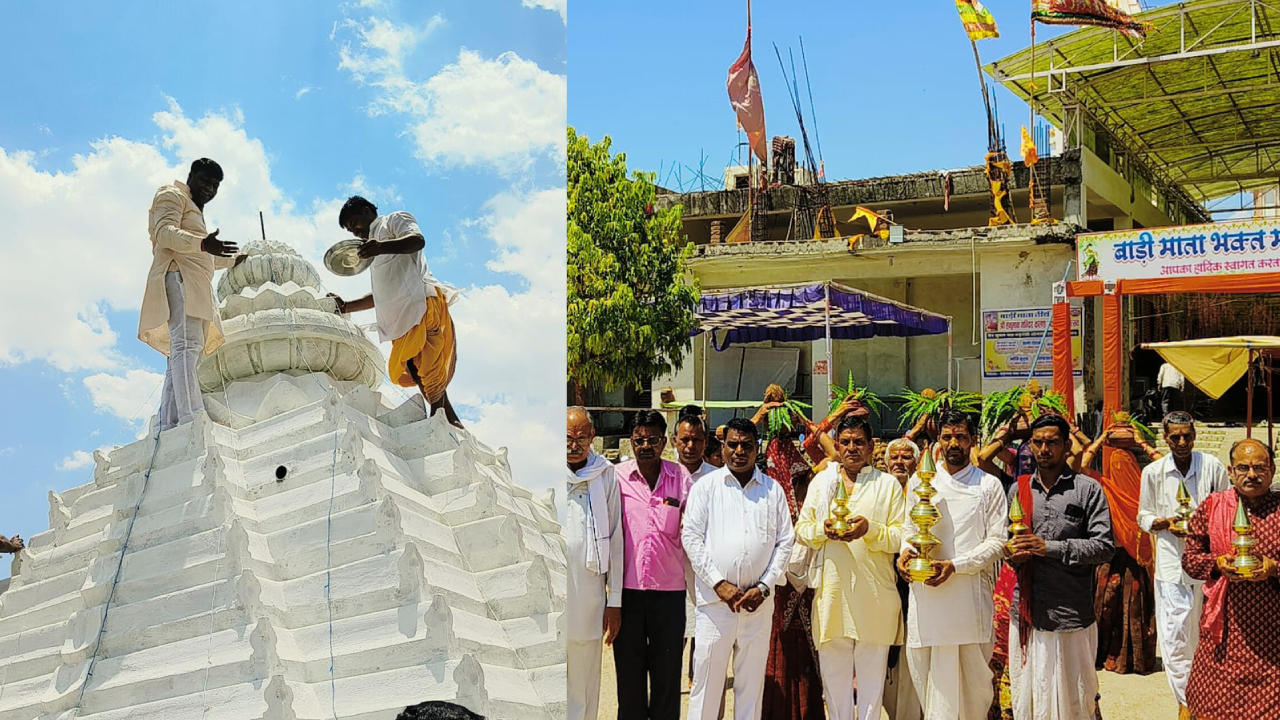 बाड़ी माता धाम में हनुमान मंदिर के मुख्य शिखर पर कलश स्थापित।